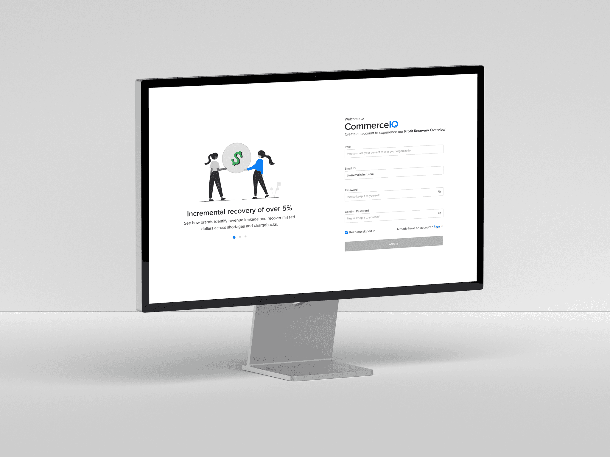 This concept explored how prospects could estimate recovery and preview PRA value without going through a full sales cycle.
